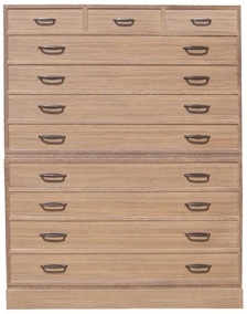 35ハイチェスト9は引出を浅く衣類をあまり重ねないで収納できるようにしました。これも、本来の和服をあまり重ねず、しわにしないようにと考えられたカタチです。